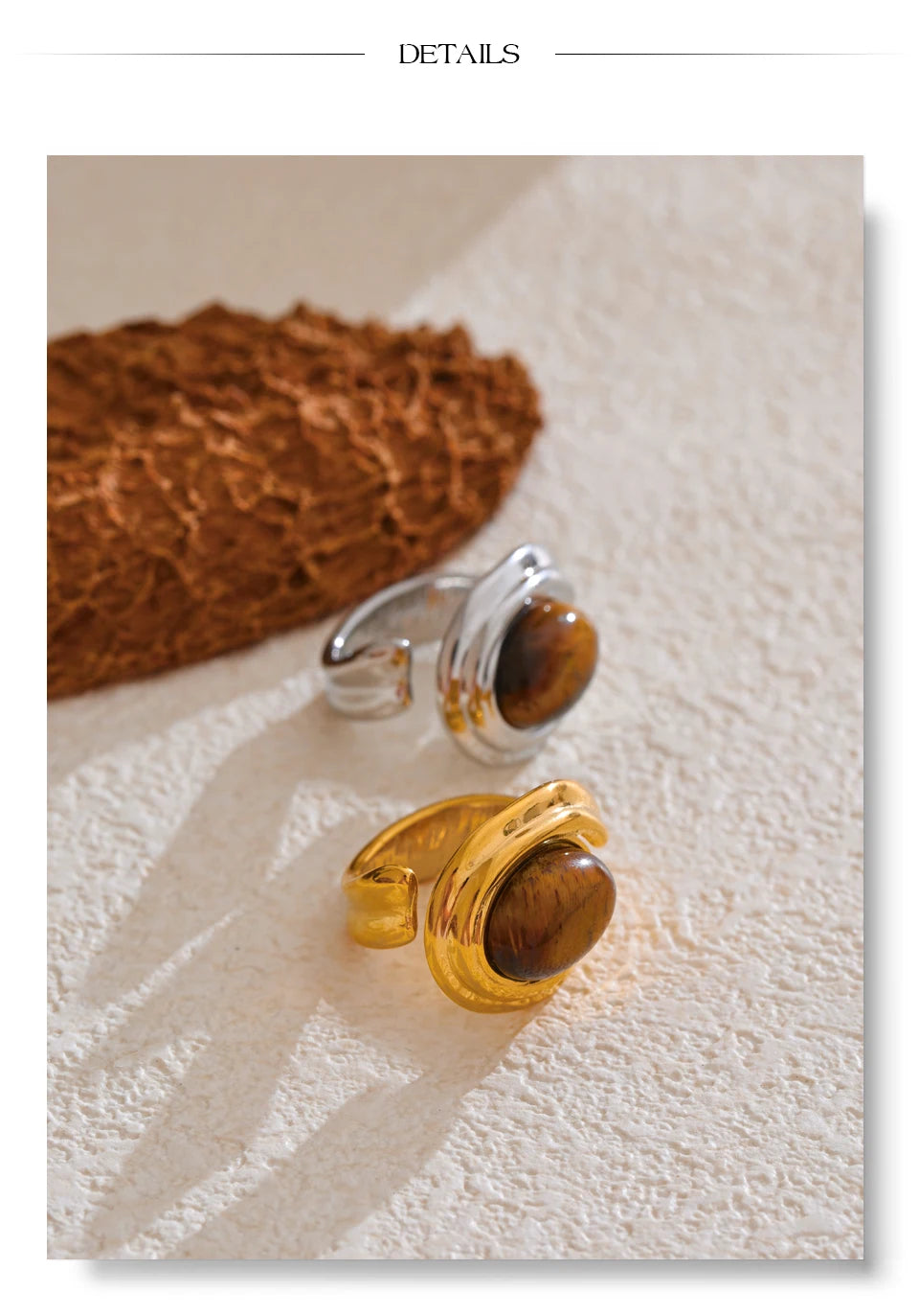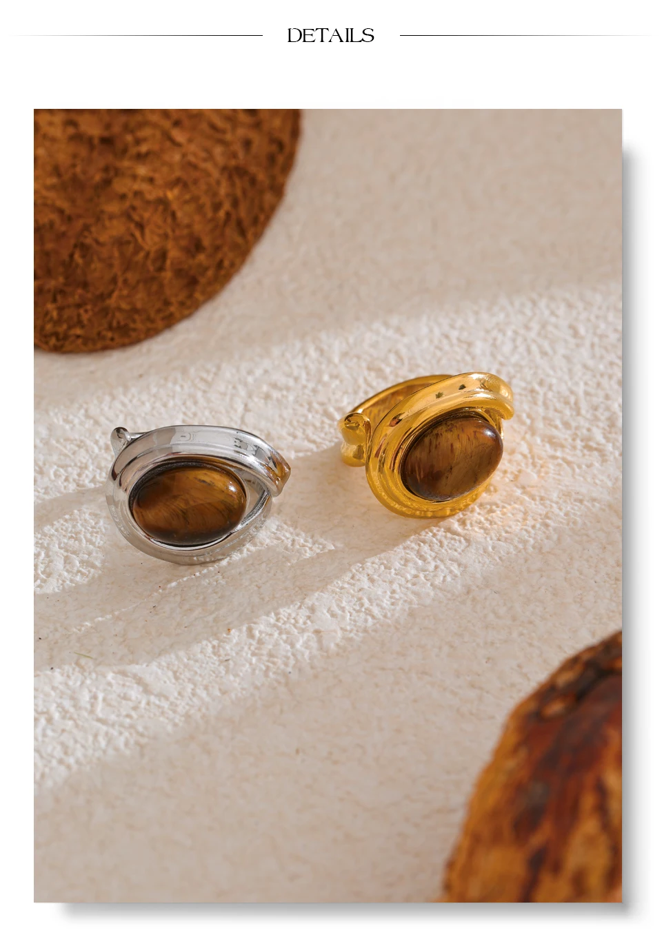 Natural Tiger Stone Stainless Steel Ring – Bold Geometric Charm (Gold/Silver)